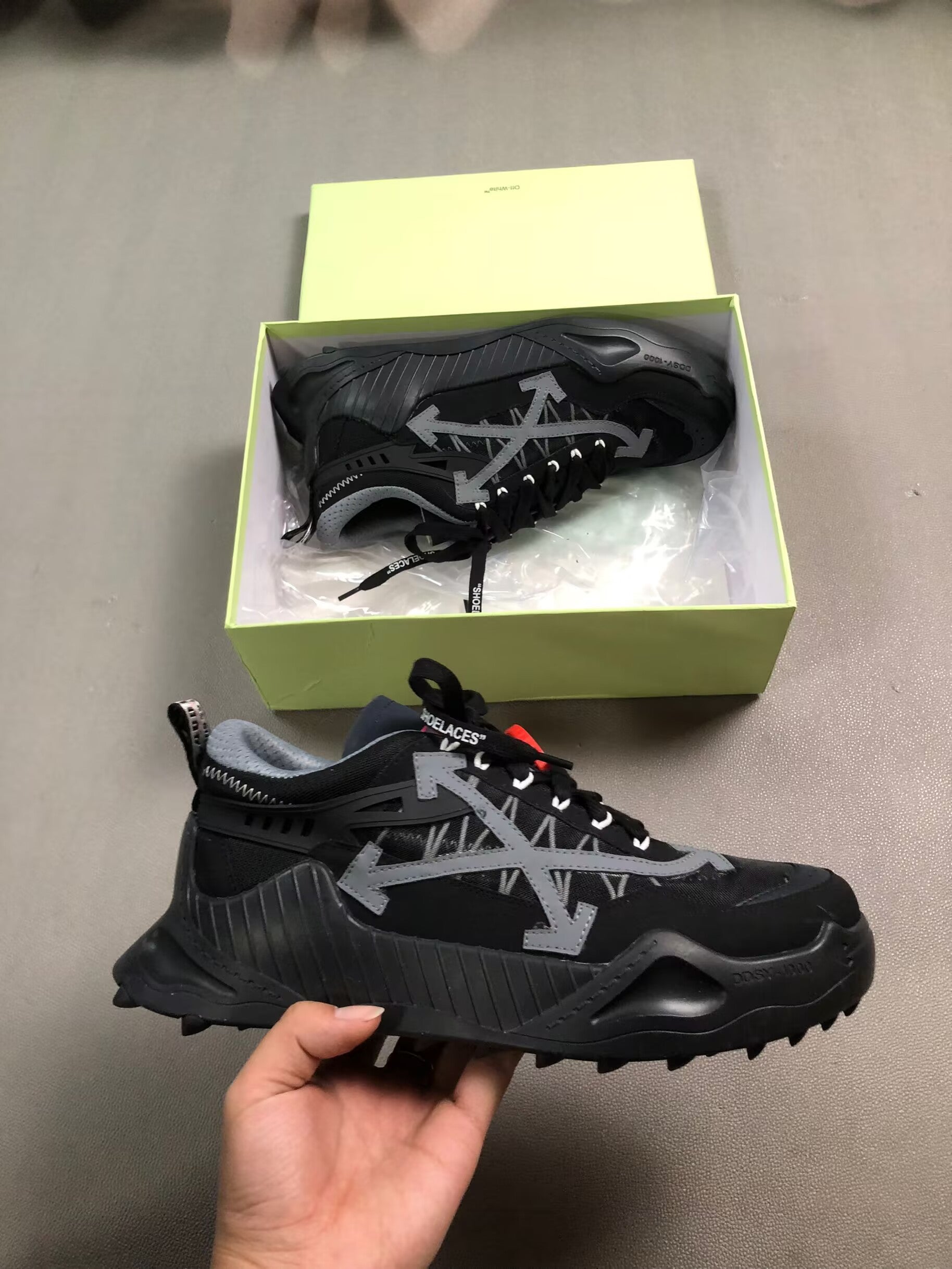 Clean design meets bold street style. These Off-White sneakers feature the signature arrow logo, zip tie tag, and a striped rubber sole—perfect for everyday wear with a designer edge.